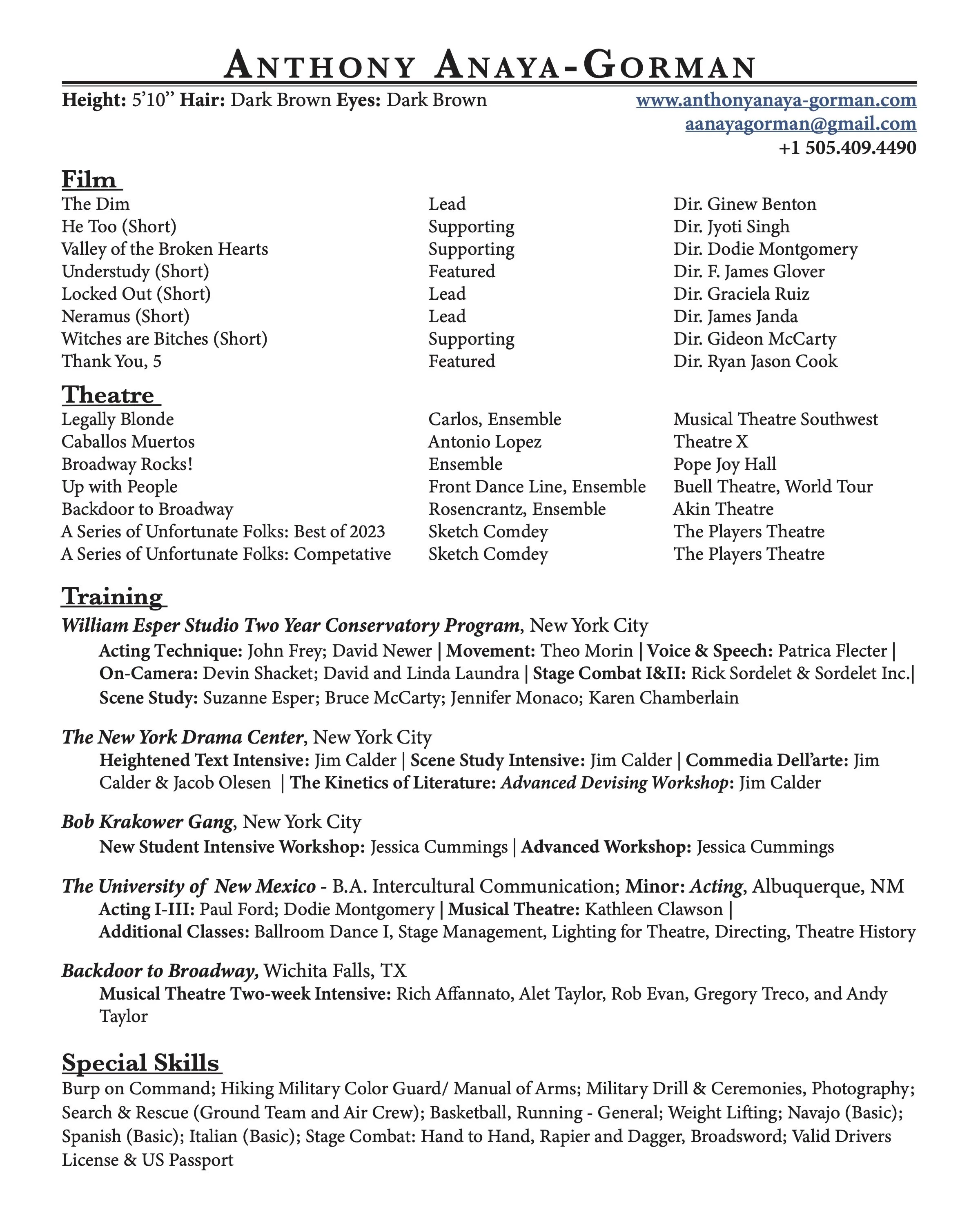 After UWP, I went back to college at The University of New Mexico and completed my B.A. in Intercultural Communication and minored in psychology and theatre. While attending UNM, I took musical theatre classes and met Broadway producer and actor, Rich Affannato (Peter and the Starcatcher), who invited me to attend his 2-week intensive, Backdoor to Broadway, in Texas. At Backdoor to Broadway I studied with Rich, Alet Taylor (Freaky Friday), Andy Taylor (Once), and Gregory Treco (Hamilton). The teachers quickly recognized me for having ‘strong acting abilities and natural instincts that are hard to teach’ and even called me “charming as sh*t!” after workshopping my rendition of “Who I’d Be” from Shrek the Musical.